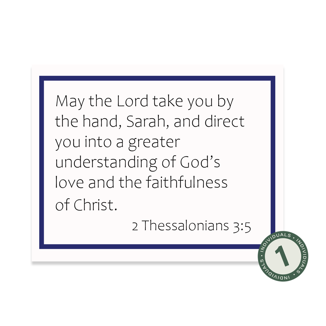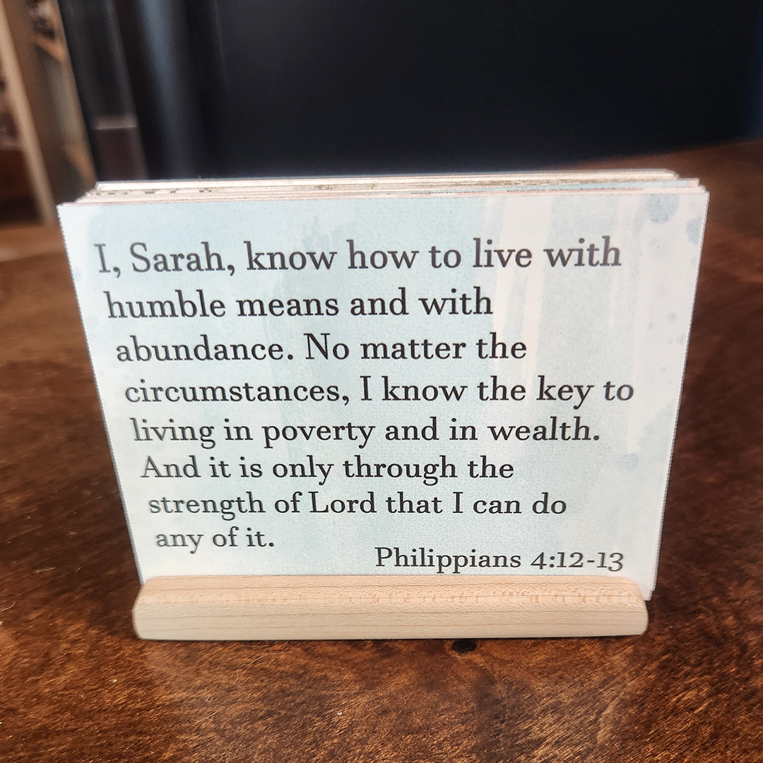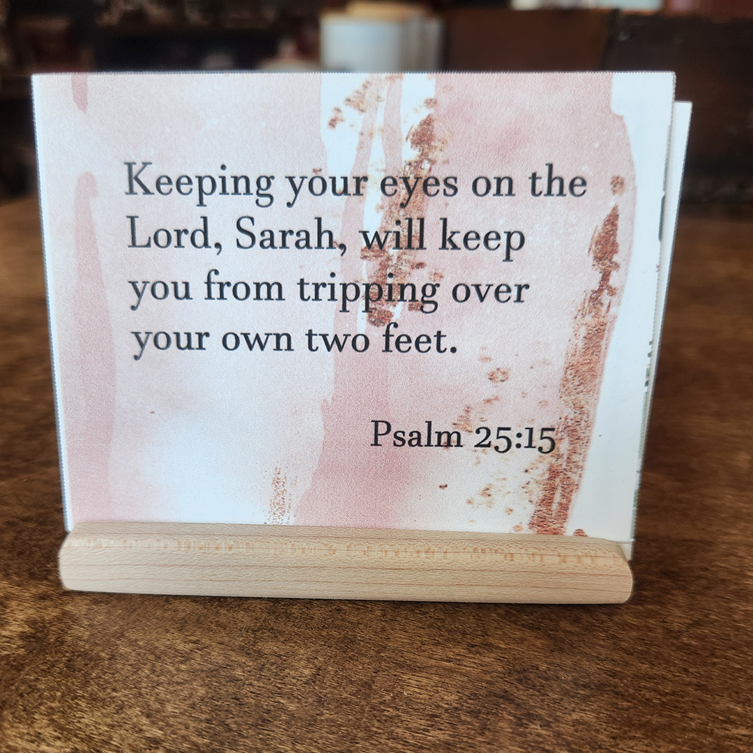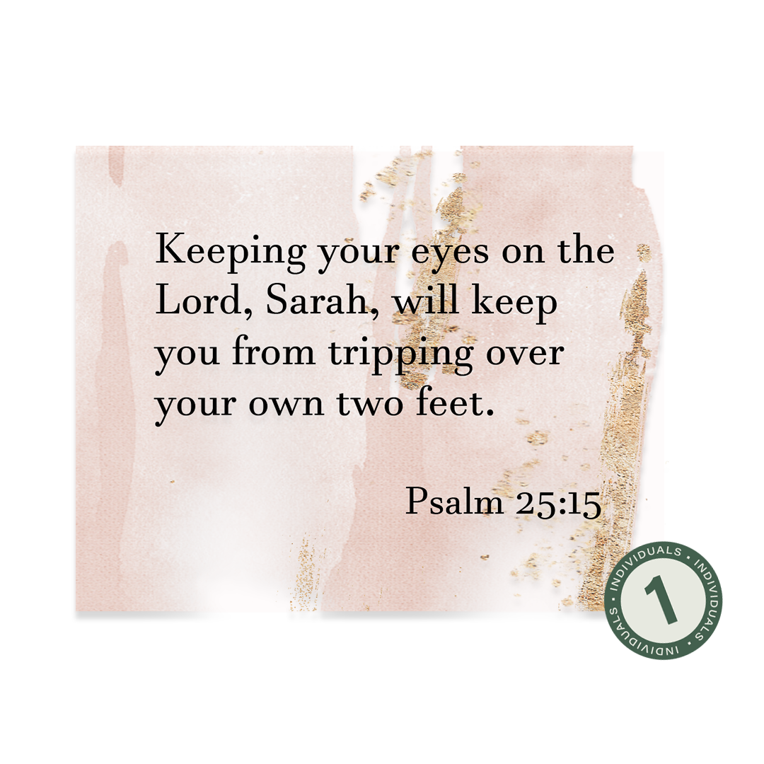This 52-card set was inspired by our 2025 Challenge and is designed to remind you to keep your eyes focused on the Lord and not on your circumstances. All year long, these verses will help you remember He is in control, and He can be trusted to walk with you through whatever you are facing and He will be faithful to provide what you need. Each set includes 52 personalized paraphrased verse cards, with your choice of one of the four designs, and includes a wood holder.