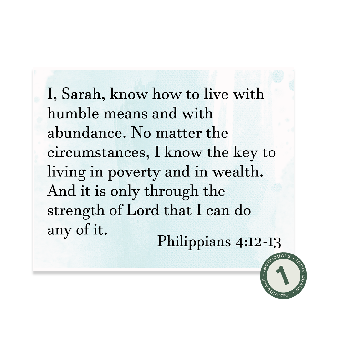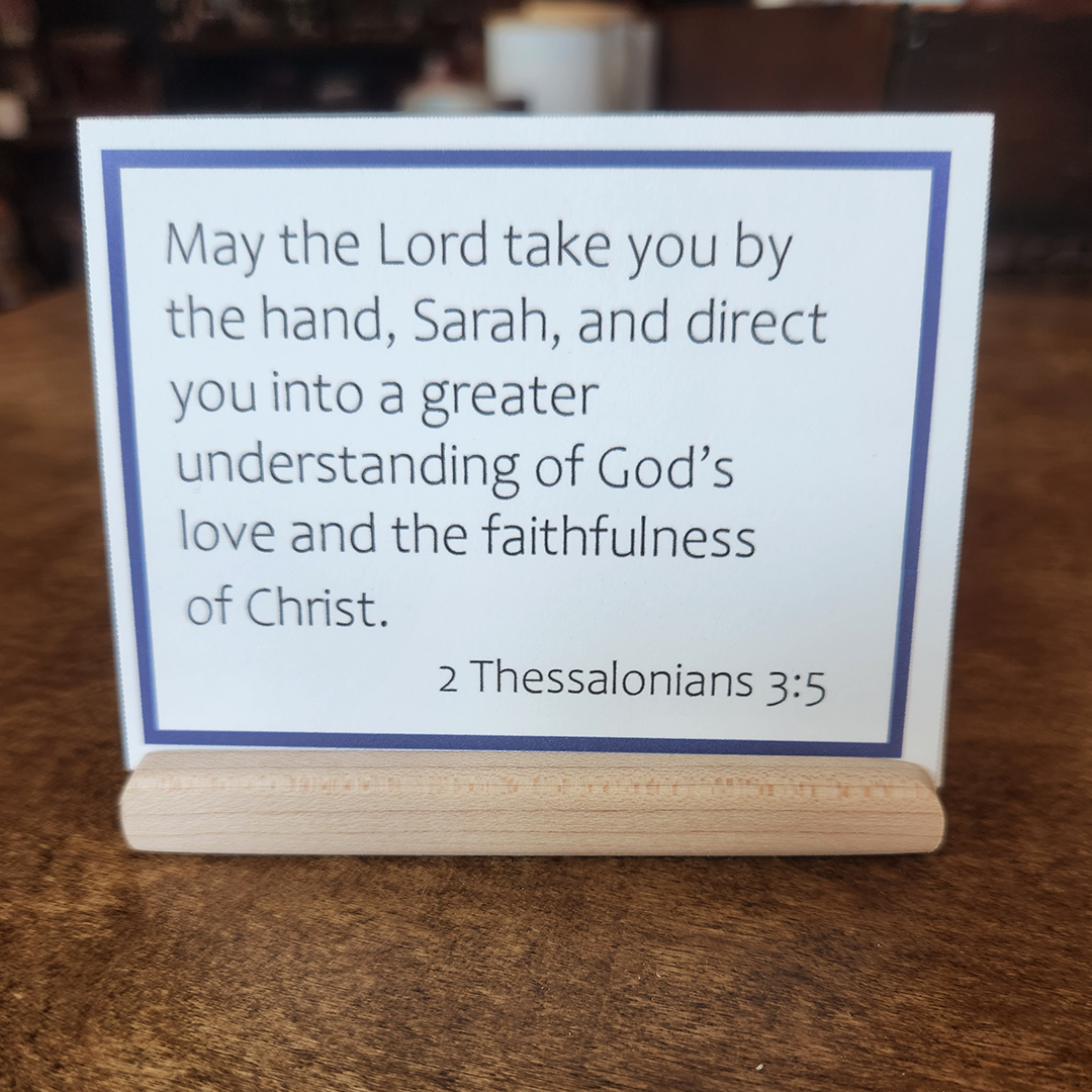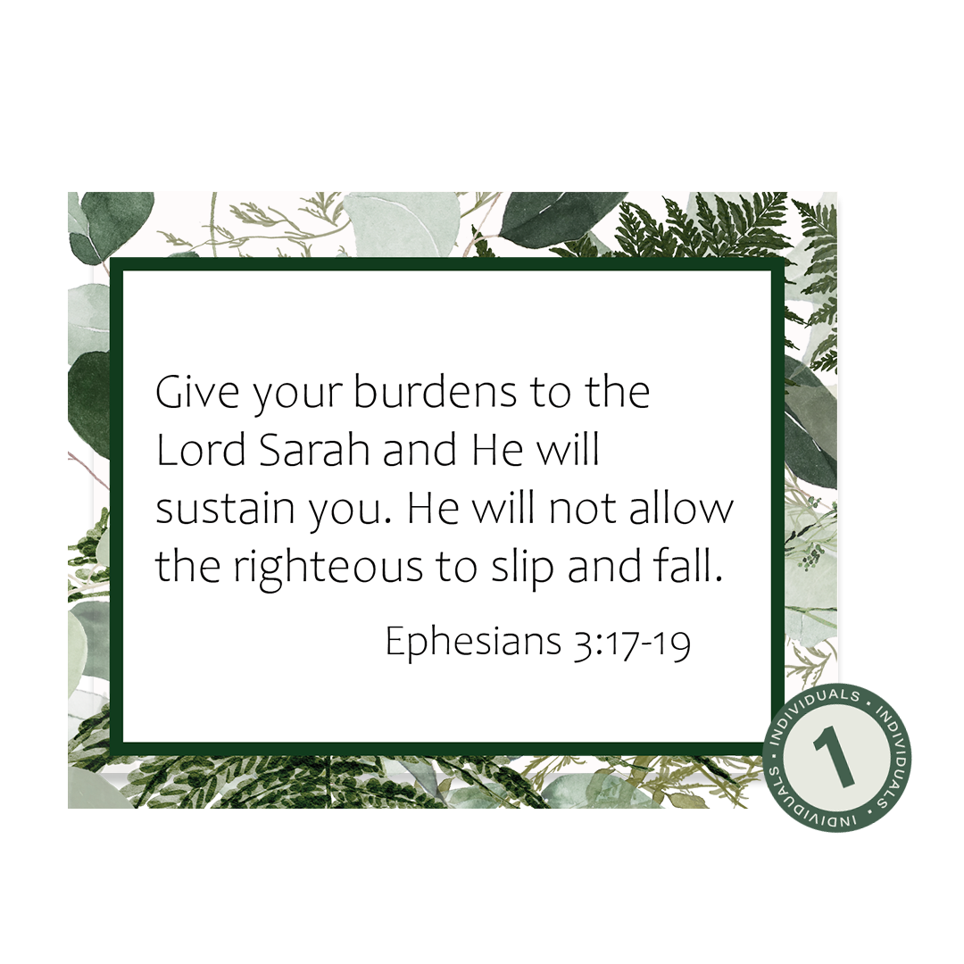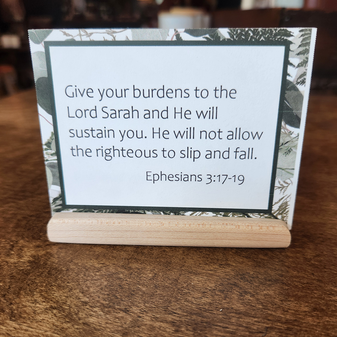 This 52-card set was inspired by our 2025 Challenge and is designed to remind you to keep your eyes focused on the Lord and not on your circumstances. All year long, these verses will help you remember He is in control, and He can be trusted to walk with you through whatever you are facing and He will be faithful to provide what you need. Each set includes 52 personalized paraphrased verse cards, with your choice of one of the four designs, and includes a wood holder.