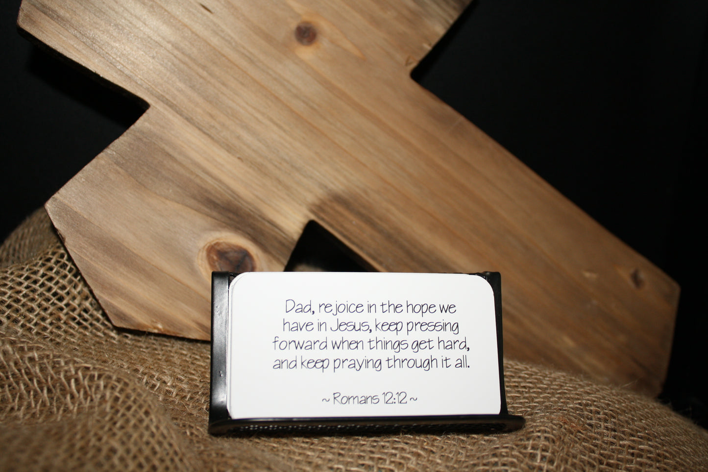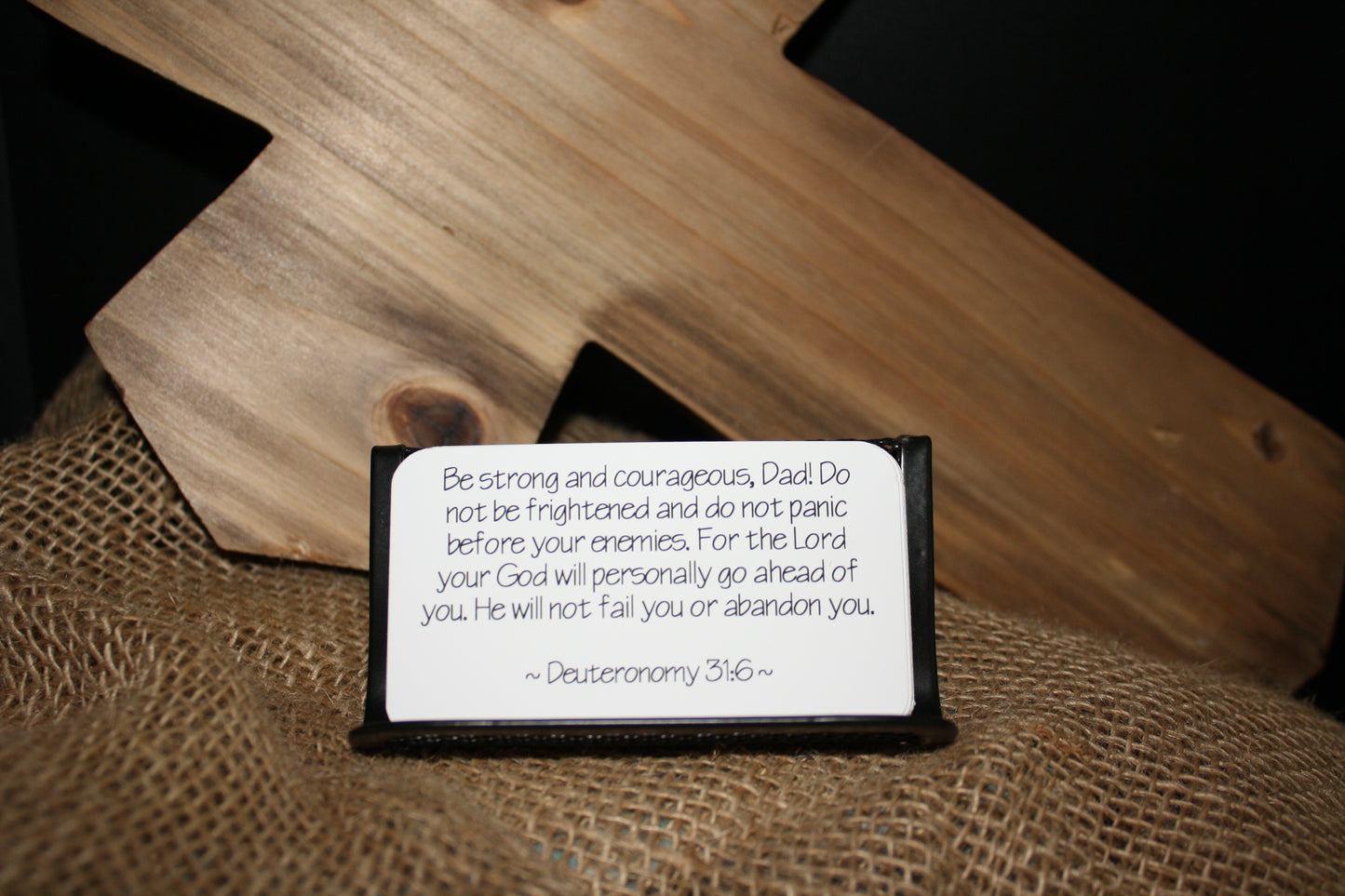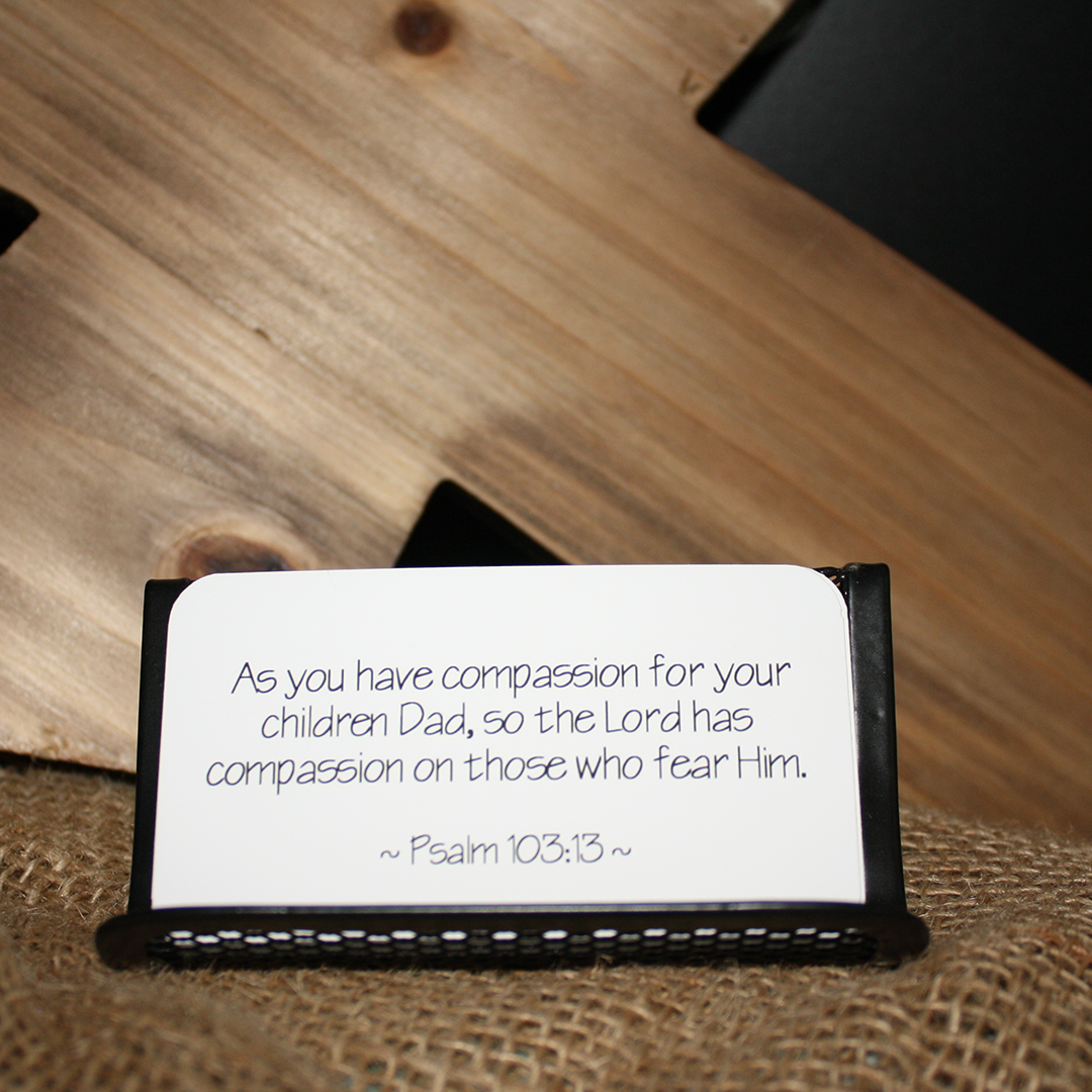 This set includes 30 personalized paraphrased verse cards from throughout Scripture with the intention of challenging and encouraging men in their roles as father and husband. Each set includes 30 personalized paraphrased verse cards from throughout Scripture and can be purchased with either a metal ($21.95) or wood ($24.95) cardholder, hole punched with a binder ring ($21.95), or simply as a set of cards ($18.95).