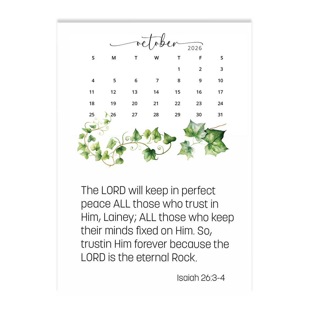My ALL in ALL calendar reminds us to love God with ALL we've got! There are three different designs to choose from: Clean Cut, Eucalyptus, and Ivy. This personalized, decorative 12-month calendar can sit on the kitchen counter, a desk, or a nightstand and makes a great gift for all. The calendar comes with your choice of wood holder ($27.95) or easel ($21.95).